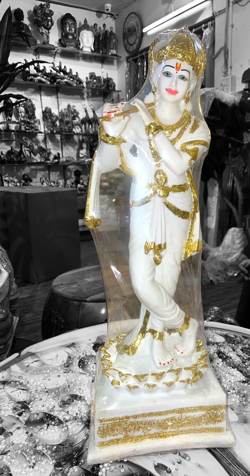 Celebrate divine beauty and grace with this exquisitely crafted Krishna idol, measuring 15 inches in height. This detailed statue depicts Lord Krishna in a serene and playful pose, symbolizing love, compassion, and divine wisdom. Perfect for pooja rooms, living rooms, or spiritual spaces, this idol brings a sense of peace and devotion to any setting. Crafted with fine artistry, it makes a thoughtful gift or a timeless addition to your spiritual décor.